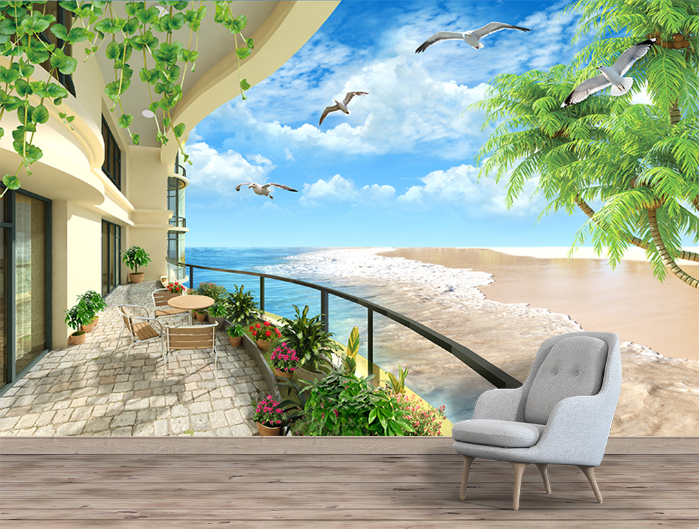 Introduce an expansive and refreshing view to your space with this multi-panel canvas art featuring the 3D Beach Balcony Wallpaper. This captivating artwork creates the illusion of a vibrant balcony overlooking a sun-drenched beach with gentle waves, swaying palm trees, and seagulls soaring in a clear blue sky.