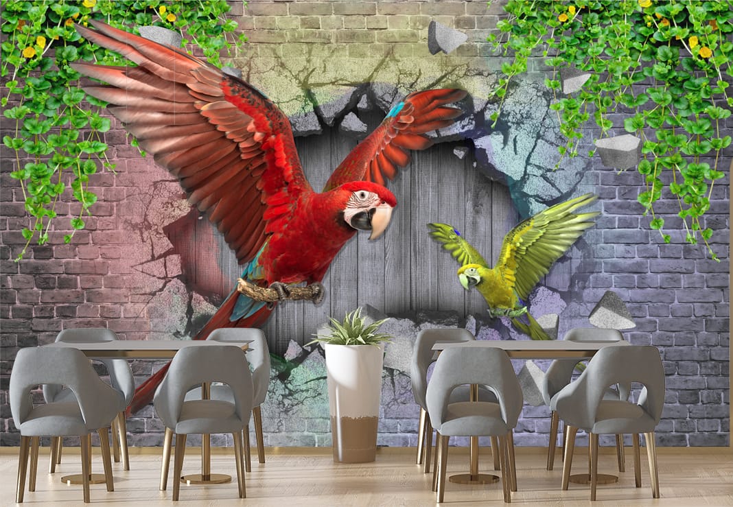 Transform your space with our 3D Parrot Wallpaper. This wallpaper features vibrant parrots bursting through a brick wall. Creating a lively and eye-catching focal point for any room. High-quality prints ensure a lasting and visually stunning decor. Ideal for adding a touch of nature and color to your space. Custom Canvas Print Nepal options are available. Explore our nature and animal wallpapers for dynamic designs.