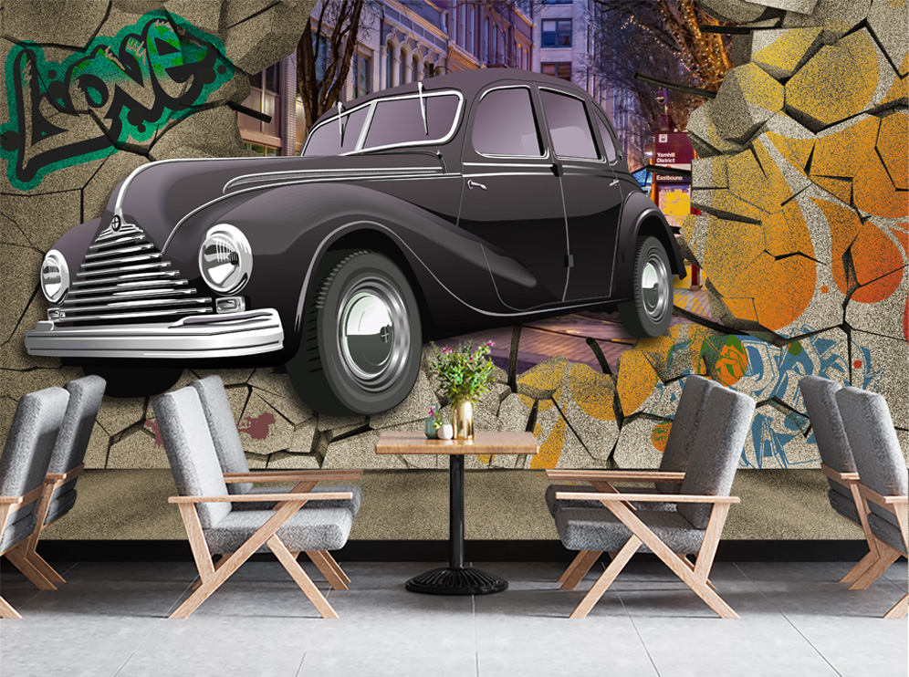Transform your wall with the trendy 3D Retro Black Car Graffiti Mural. This design creates the illusion of a sleek black vintage car breaking through a cracked wall adorned with colorful graffiti, including the word “LOVE”. The urban street scene peeking through the cracks adds to the unique and stylish aesthetic of this mural.