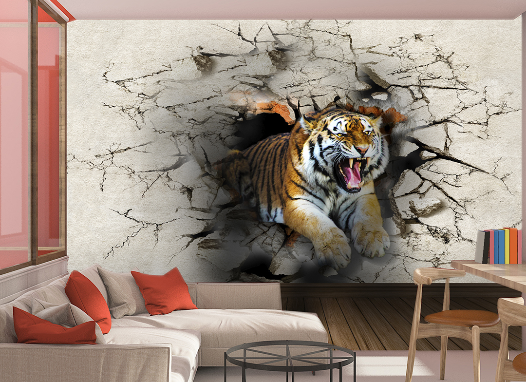 Transform your wall with the impactful 3D Roaring Tiger Breaking Wall Mural. This design creates the thrilling illusion of a fierce tiger with a powerful roar, forcefully breaking through a cracked and textured wall. The intense gaze and dynamic pose of the tiger will add a bold and adventurous statement to any room.