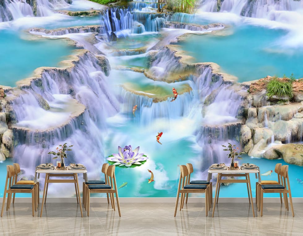 Create a captivating focal point with our 3D Waterfall Mural. This mural features a breathtaking multi-tiered waterfall with crystal-clear turquoise waters, lush greenery, and a beautiful lotus flower, creating a serene and immersive 3D effect. Each mural is printed with high-quality materials and vibrant inks, ensuring a lasting and visually stunning addition to your decor. Perfect for living rooms, bedrooms, bathrooms, or any space seeking a natural and calming vibe, this mural adds a touch of paradise and tranquility. Display it in your main area to create an unforgettable atmosphere. Explore our collection of 3D and nature murals for more immersive and serene designs.