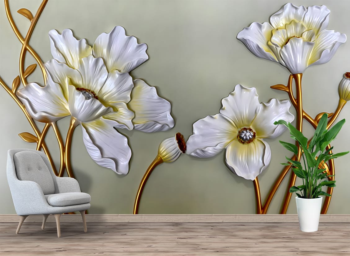 Bring refined beauty to your space with the 3D White Floral Gold Accent Mural Print. This elegant mural features large, intricately detailed white flowers in a 3D relief style, gracefully accented with delicate gold stems and highlights. The combination of soft florals and metallic accents creates a sophisticated, artistic focal point for any interior.