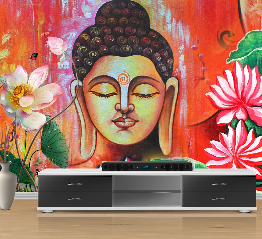 Transform your wall with the Abstract Buddha Lotus Wallpaper. This vibrant design features a serene Buddha face with closed eyes and a tilak, surrounded by stylized pink and white lotus flowers and green leaves. The abstract background with blended red, orange, and yellow hues creates a unique and spiritually uplifting atmosphere in any room.