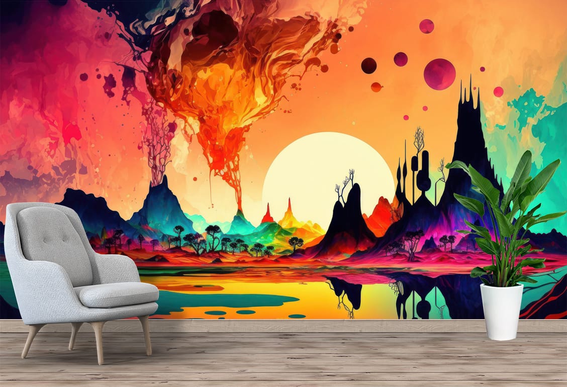 Transform your wall with the imaginative Abstract Colorful Landscape Mural Print. This design features a surreal and captivating landscape rendered in a bold and vibrant abstract style. Melting forms, flowing colors, and fantastical elements create a unique and eye-catching piece of modern art that will add a touch of wonder to any space.