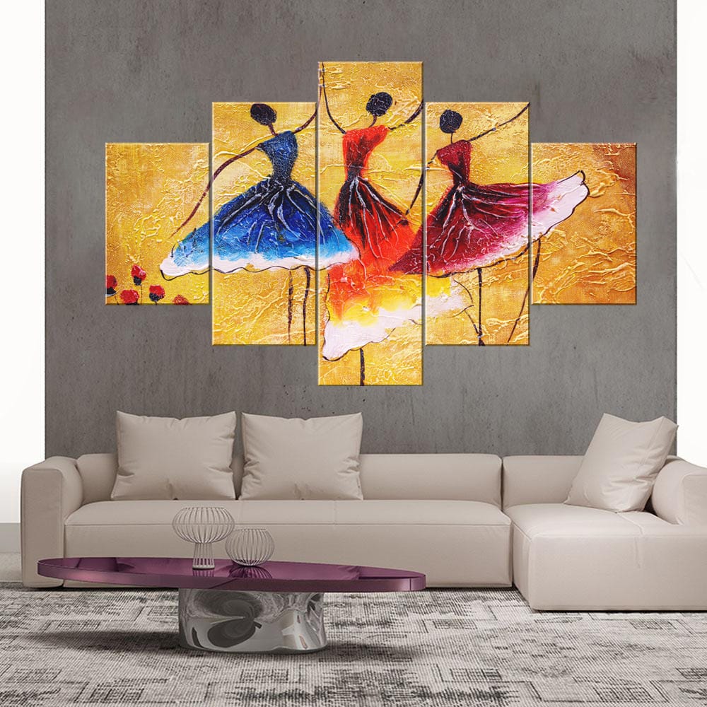 Transform your space with the vibrant Abstract Dancing Figures Canvas Print. This multi-panel canvas art showcases abstract figures in flowing, colorful dresses, captured in dynamic poses of dance against a rich, textured golden background. This piece brings energy and artistic flair to any room.