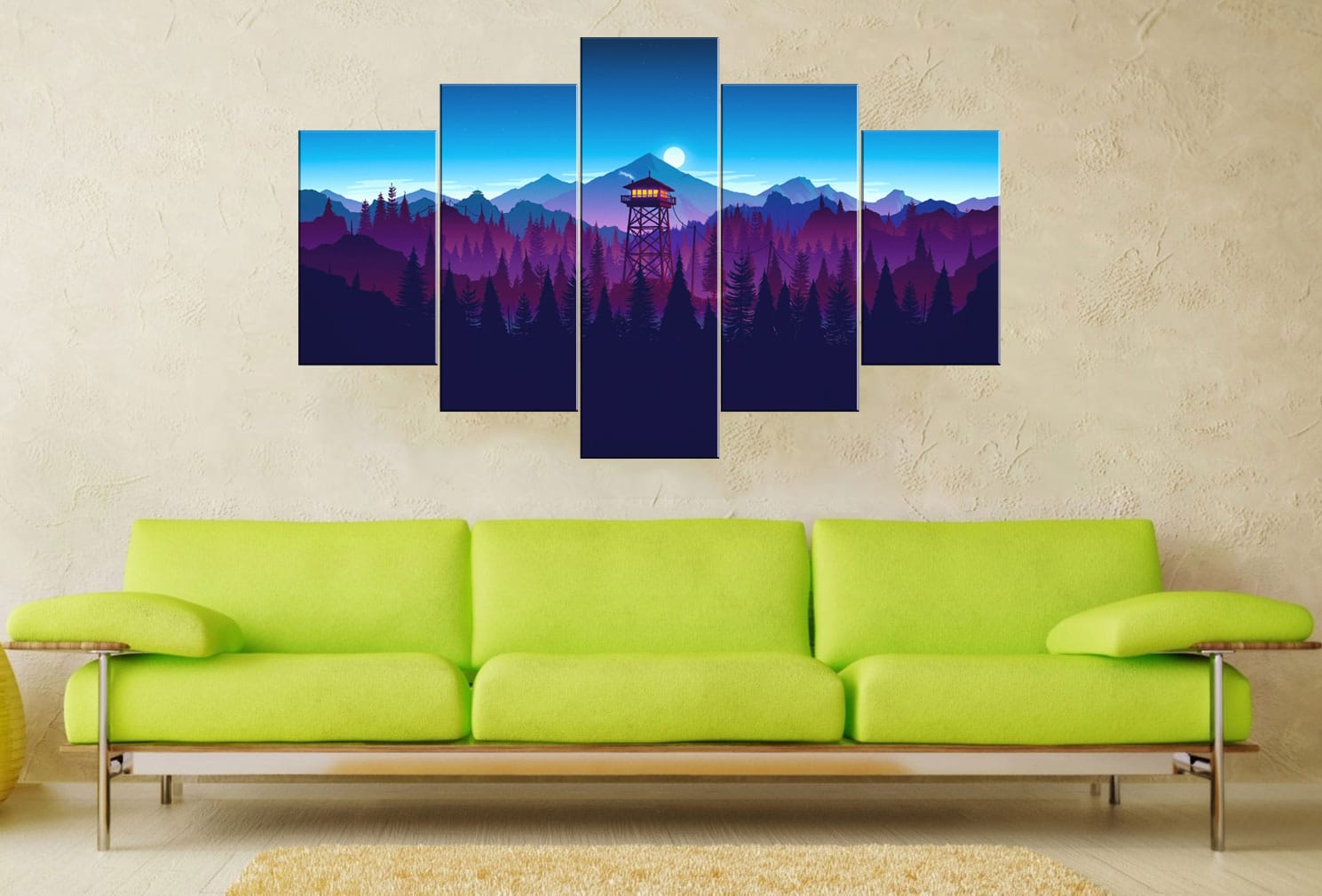 Transform your space with the stylized Abstract Mountain Forest Canvas Print. This multi-panel canvas art features an abstract and modern depiction of a mountain range and a dense forest at twilight. Deep blues and purples dominate the scene, with a fire lookout tower silhouetted against the fading light and a subtle moon. This artwork offers a contemporary and serene take on a natural landscape.