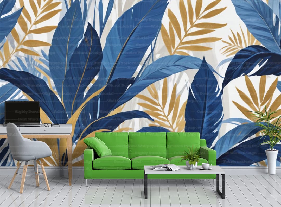 Abstract plants murals prints bring a modern and artistic interpretation of nature into your home. This mural features stylized leaves in bold blue and golden tones, creating a visually striking and contemporary botanical design. The abstract patterns and rich colors add a touch of sophisticated charm to your space. Perfect for those seeking a unique and modern decor piece. Crafted with high-quality materials, this mural transforms your walls into a work of art. Also, explore our collection of murals for more inspiring designs.