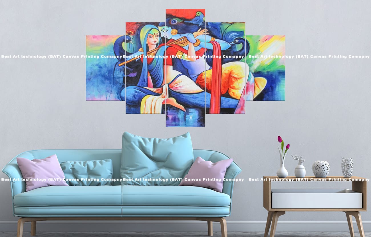 - Premium Quality Canvas Print: High-resolution multi-panel abstract design featuring Radha and Krishna with a flute and bird.