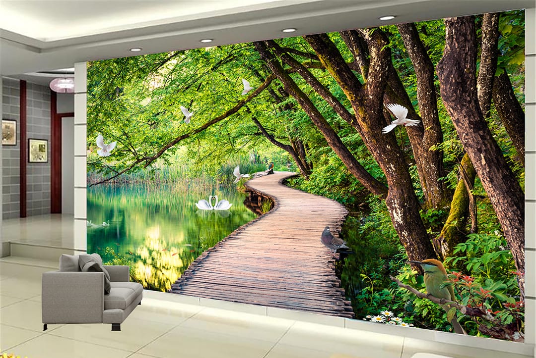 • Premium Quality Mural: High-resolution design showcasing a wooden path by a lake with swans, birds, and lush greenery.