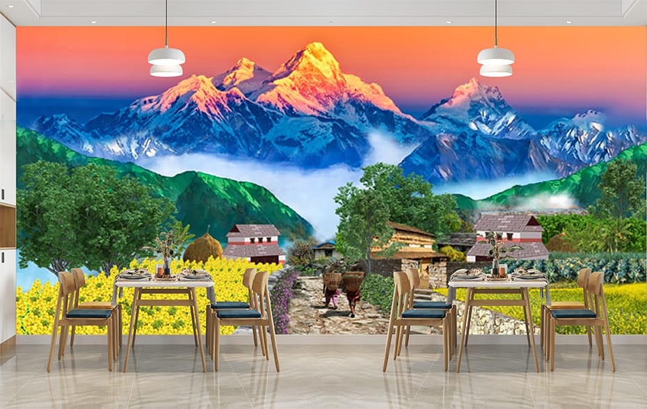 • Premium Quality Mural: High-resolution design showcasing the Annapurna mountains, a traditional Nepali village, and the sunrise.