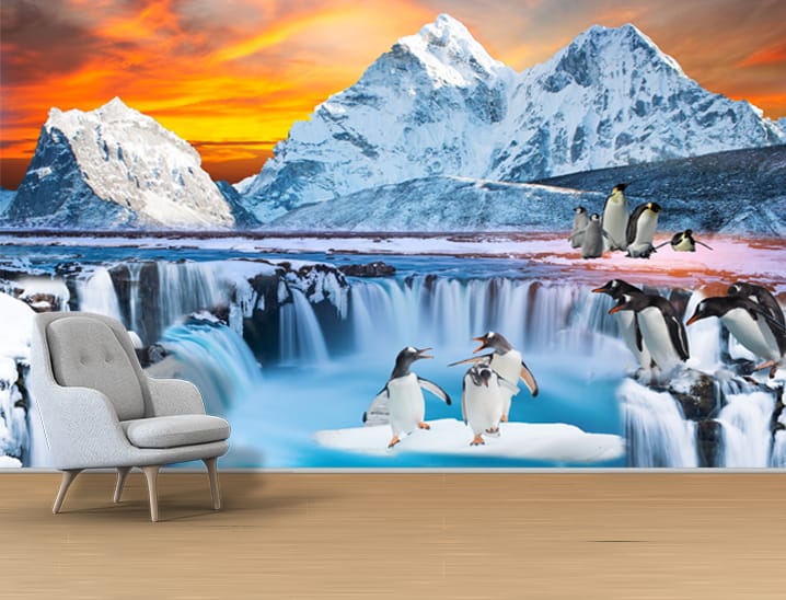 - Premium Quality Mural: High-resolution design showcasing penguins, waterfalls, ice floes, snow-capped mountains, and a sunset.