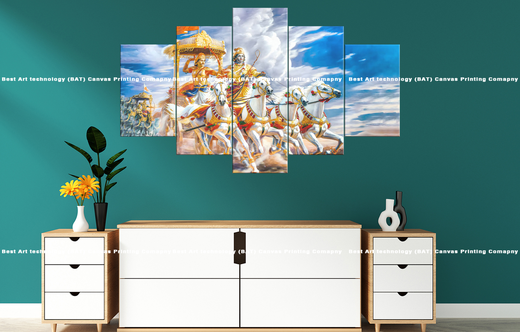Transform your living room or prayer space with the Arjuna Krishna Chariot Canvas. This stunning multi-panel canvas print depicts the iconic scene of Arjuna and Krishna on their divine chariot, symbolizing guidance, wisdom, and the epic narrative of the Bhagavad Gita within the Mahabharata. The vibrant colors and detailed rendering of the scene create a captivating and spiritually uplifting atmosphere.