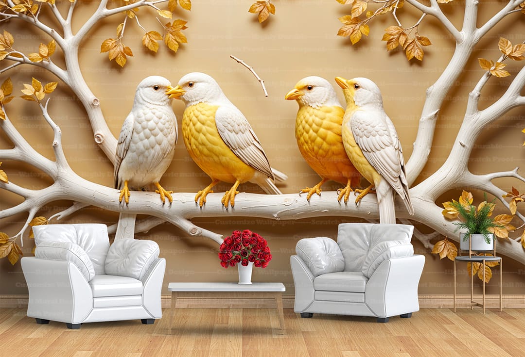 Art of the bird prints bring a touch of natural elegance and serenity to any room. This mural features four beautifully rendered birds perched on a detailed branch with golden leaves, set against a textured background, creating a captivating 3D effect. The warm tones and intricate details add a touch of sophisticated charm to your space. Perfect for nature lovers and those seeking a peaceful decor piece. Crafted with high-quality materials, this mural transforms your walls into a serene nature scene. Also, explore our collection of murals for more inspiring designs.