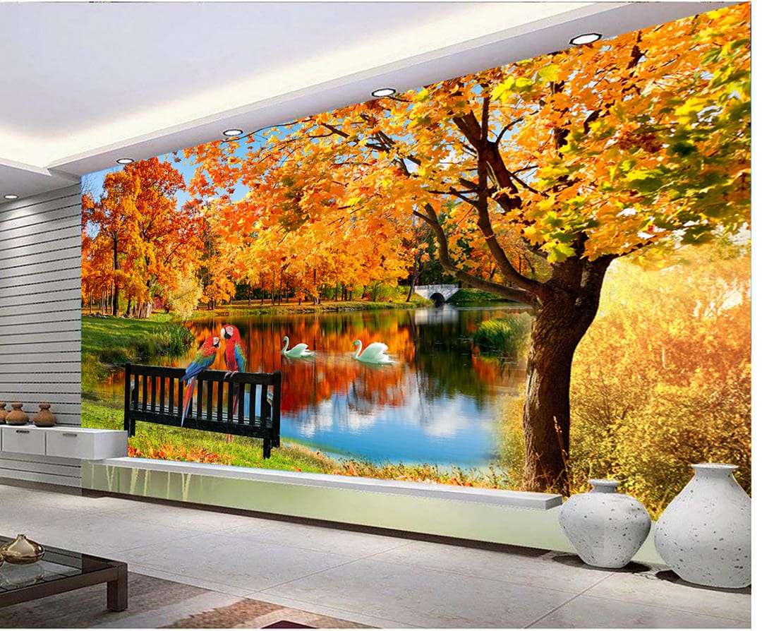 Transform your space in Lalitpur with the Autumn Lake Swan Parrot Mural, a stunning depiction of a serene autumn landscape. This mural captures the essence of fall with its vibrant orange and yellow foliage, reflecting beautifully on the calm lake surface. The distant bridge and the warm sunlight filtering through the trees add depth and a sense of tranquility to the mural. This design is perfect for creating a cozy and inviting atmosphere in a living room, bedroom, or even a waiting area. The rich colors and detailed rendering of the natural elements make this mural a captivating focal point in any room. Explore our other nature-themed and seasonal murals for serene designs.