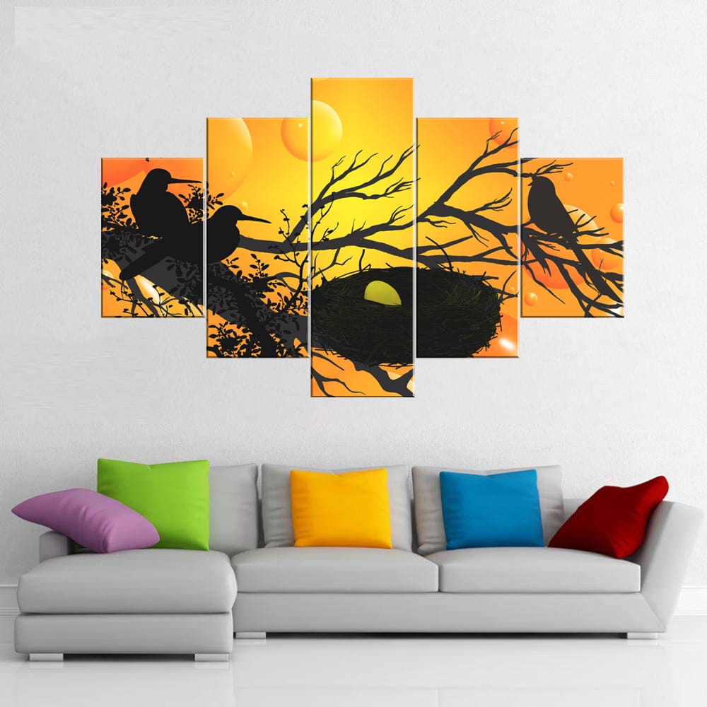 Bird Nest Canvas Prints offer a unique and artistic representation of nature. This set features five individual canvas prints that together form a scene of bird silhouettes perched on branches near a nest with an egg. The striking black silhouettes against a warm, orange background create a visually captivating and modern aesthetic. This multi-panel set is perfect for nature lovers and those looking to add a touch of artistic charm to their living space. Crafted with high-quality materials, these canvas prints transform your walls into a scene of nature’s simple beauty. Also, explore our collection of nature and silhouette canvas prints for more inspiring designs.