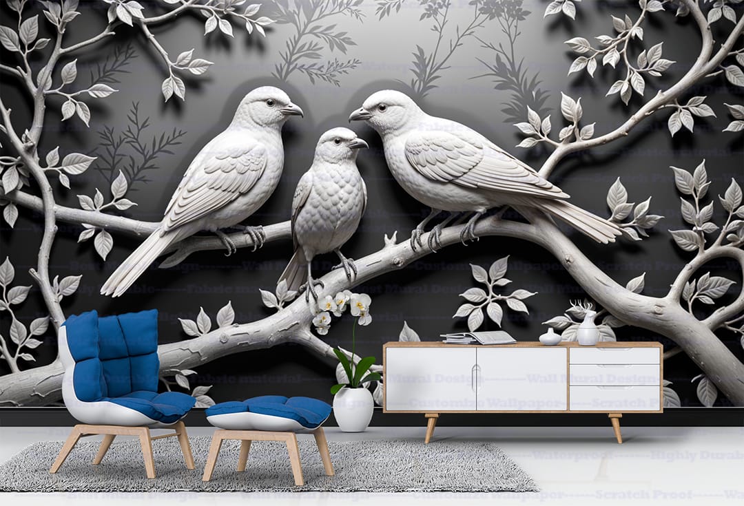 Birds murals prints bring a touch of natural elegance and serenity to any room. This mural features three beautifully rendered birds perched on a detailed branch, set against a textured background, creating a captivating 3D effect. The monochromatic palette adds a sophisticated and calming touch to your space. Perfect for nature lovers and those seeking a peaceful decor piece. Crafted with high-quality materials, this mural transforms your walls into a serene nature scene. Also, explore our collection of murals for more inspiring designs.