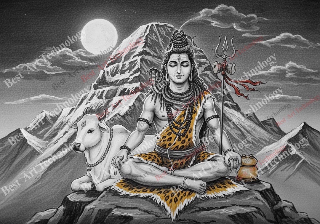 Invite a sense of serene majesty into your space with this captivating single-panel canvas art. Featuring a beautiful black and white illustration of Lord Shiva in peaceful meditation alongside his devoted companion Nandi, set against a backdrop of majestic mountains under the soft glow of a full moon, this Black and White Shiva Nandi Mountain Canvas offers a calming and artistic spiritual presence.