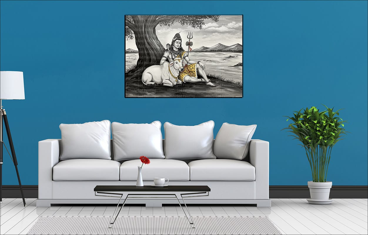Invite a sense of serene harmony into your space with this unique single-panel canvas art. Featuring a beautiful black and white sketch of Lord Shiva seated peacefully under a sheltering tree with his devoted companion Nandi beside a calm body of water and distant rolling hills, this Black and White Shiva Nandi Waterside Canvas offers a calming and artistic spiritual presence.
