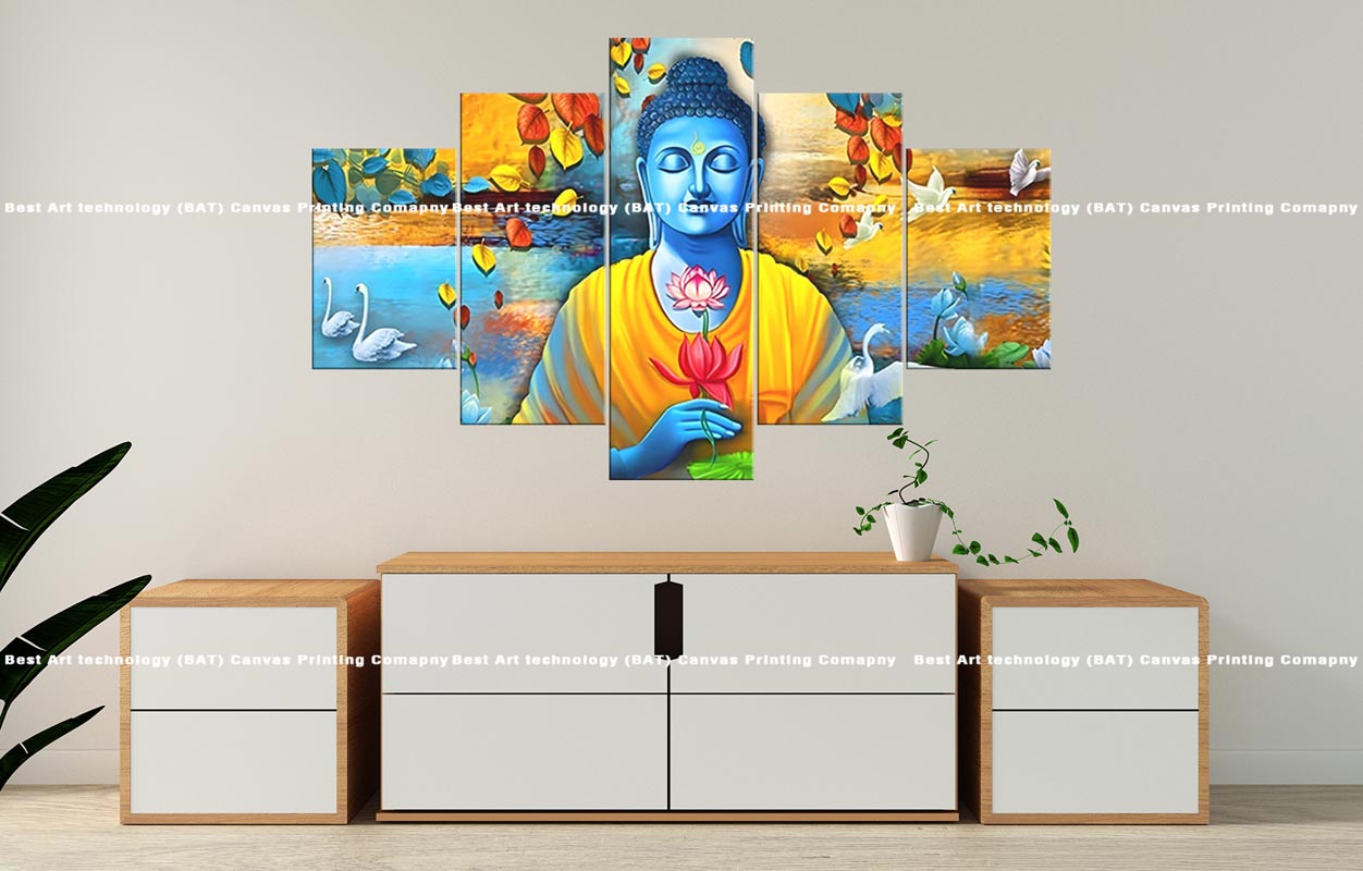 Bring a sense of profound peace and natural beauty to your space with this tranquil multi-panel canvas print. The artwork features a serene blue Buddha holding a delicate pink lotus flower, seated by a calm lake with graceful white swans and colorful autumn leaves gently falling, all spread across five panels. This Blue Buddha Lotus Swans Canvas will infuse your home with a calming and picturesque atmosphere.