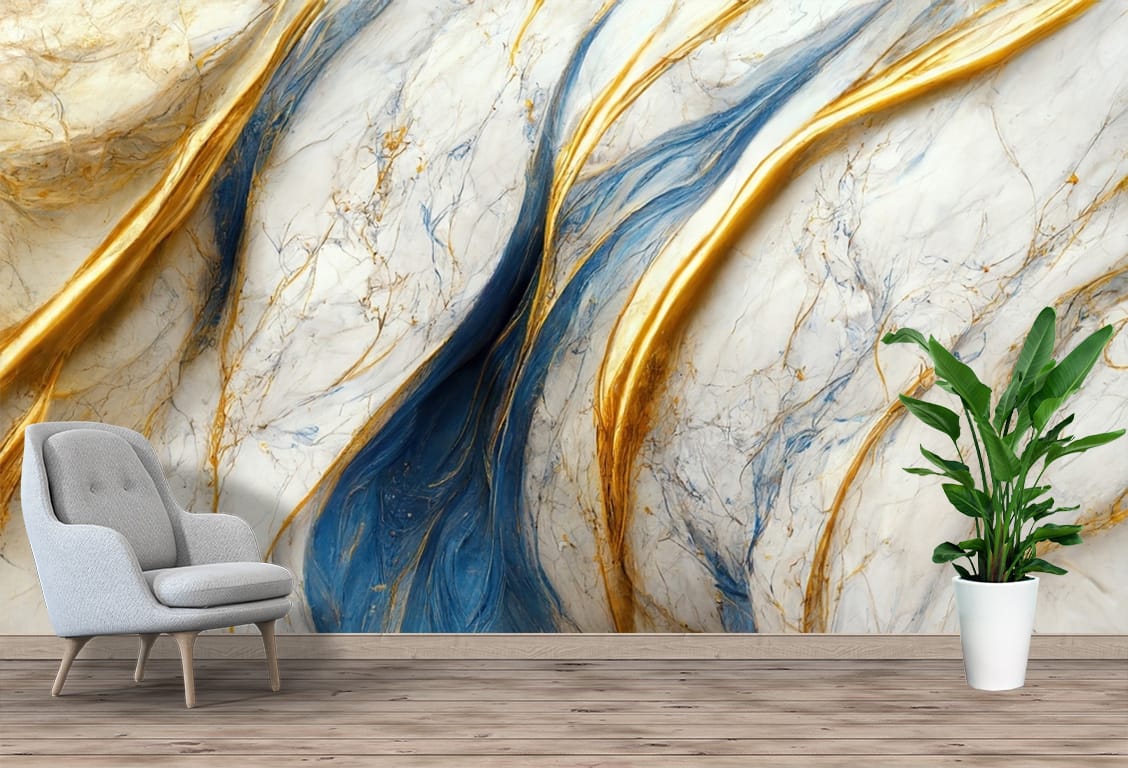 Transform your space with the Blue Gold Marble Vein Mural Print, a stunning piece that combines bold blue and gold veins flowing gracefully across a light marble backdrop. The intricate marble effect creates a sense of depth and luxury, making this mural an ideal choice for adding a sophisticated, modern touch to any room. The vibrant blue and gold veins evoke opulence and artistic flair, creating a captivating atmosphere.