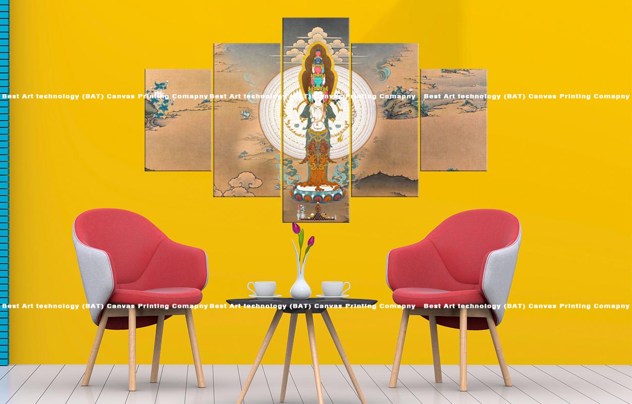 Introduce a sense of vibrant spirituality and cosmic harmony to your space with this multi-panel canvas art featuring the Bodhisattva Mandala Canvas. A colorful Bodhisattva figure with intricate detailing is depicted against a radiant and geometrically complex mandala background, presented across five panels.