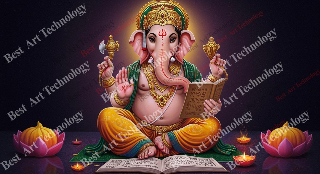 - High-Resolution Print: Captures the detailed image of Lord Ganesh seated on the book, his symbols, the glowing lamps, and lotus flowers.