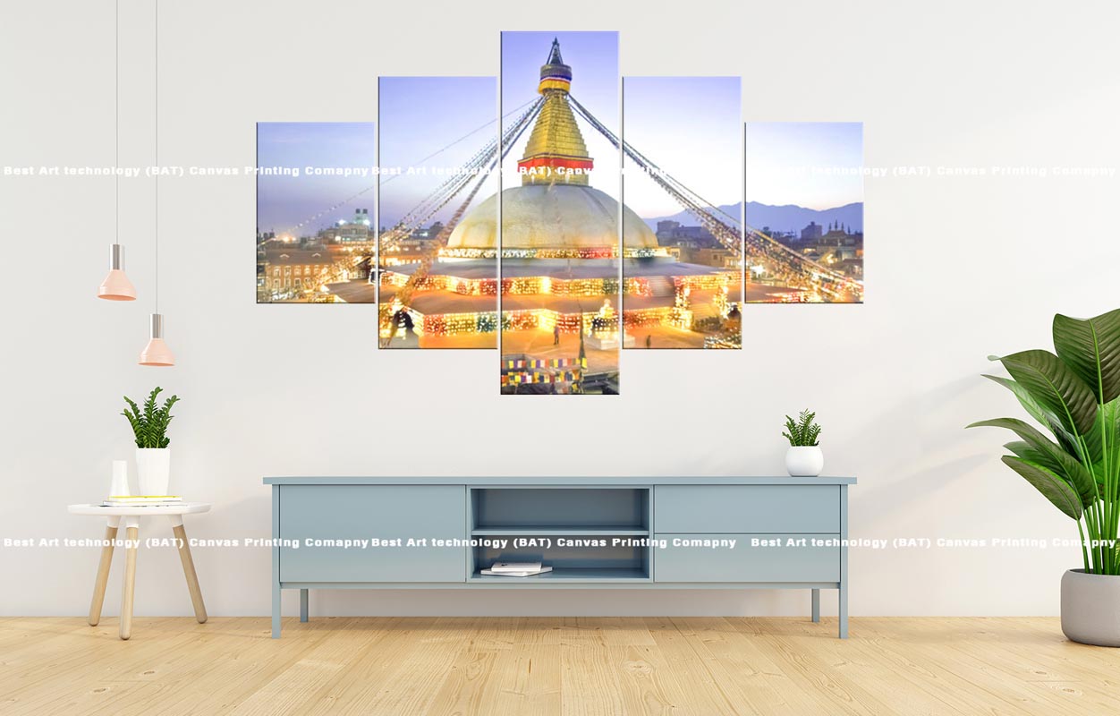 Bring the spiritual essence and architectural beauty of Nepal to your space with this stunning multi-panel canvas print. The artwork showcases the iconic Boudhanath Stupa in Kathmandu, beautifully illuminated at twilight, with the warm glow of lights contrasting against the dusky sky and surrounding cityscape, all spread across five panels. This Boudhanath Stupa Nepal Canvas will infuse your home with a sense of peace, culture, and wonder.
