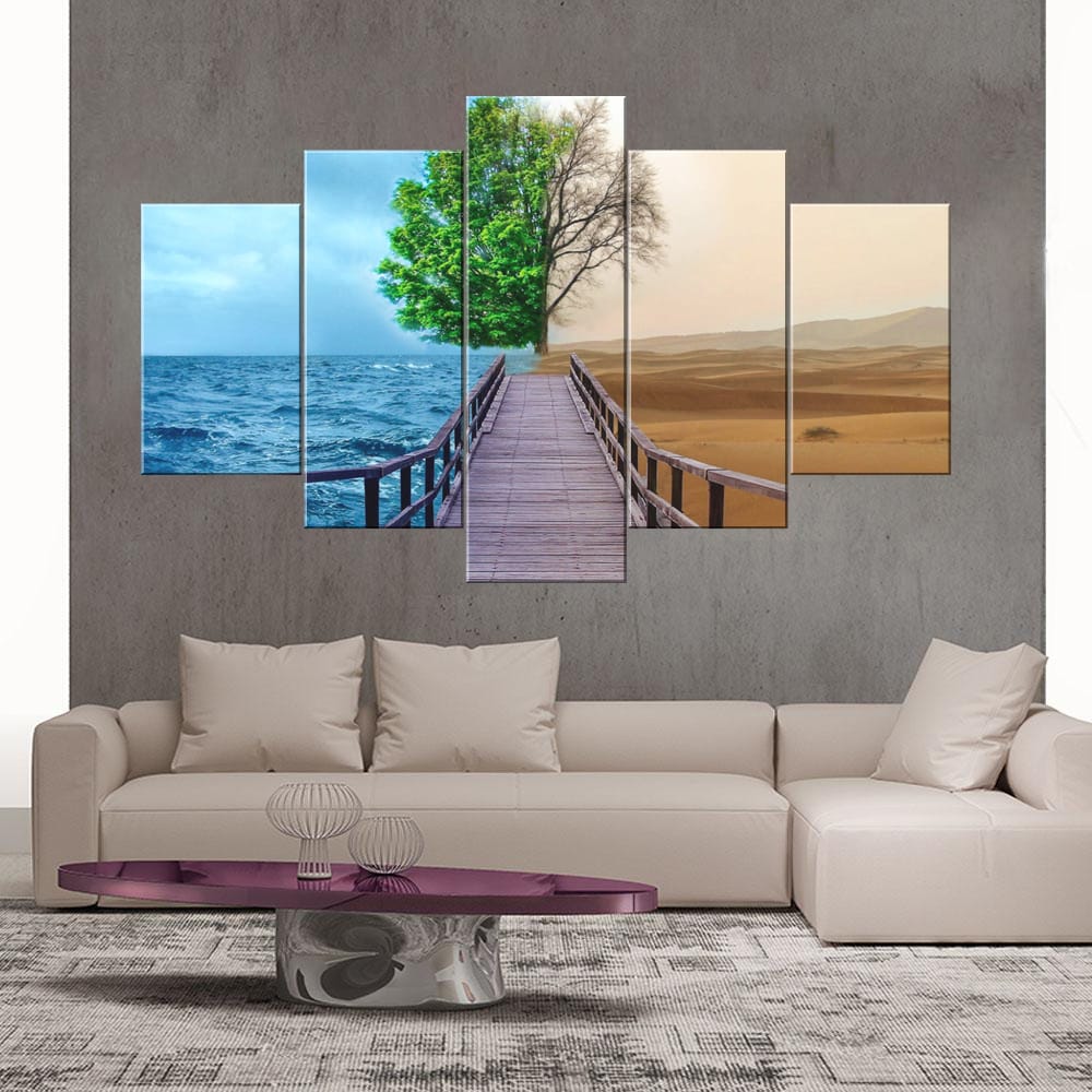 Transform your space with the unique Bridge Four Seasons Canvas Print. This multi-panel canvas art surrealistically portrays a wooden bridge extending across a landscape that seamlessly transitions through all four seasons: a wintery scene, vibrant spring foliage, lush summer greenery, and an arid autumn desert. This artwork symbolizes the passage of time and the diverse beauty of nature.
