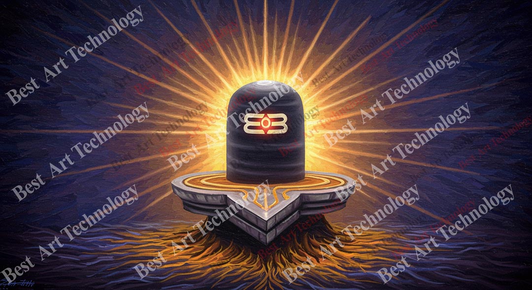 • High-Resolution Print: Captures the iconic form of the Shiva Lingam and the intense upward golden light with swirling orange energy against the detailed dark background with subtle text.