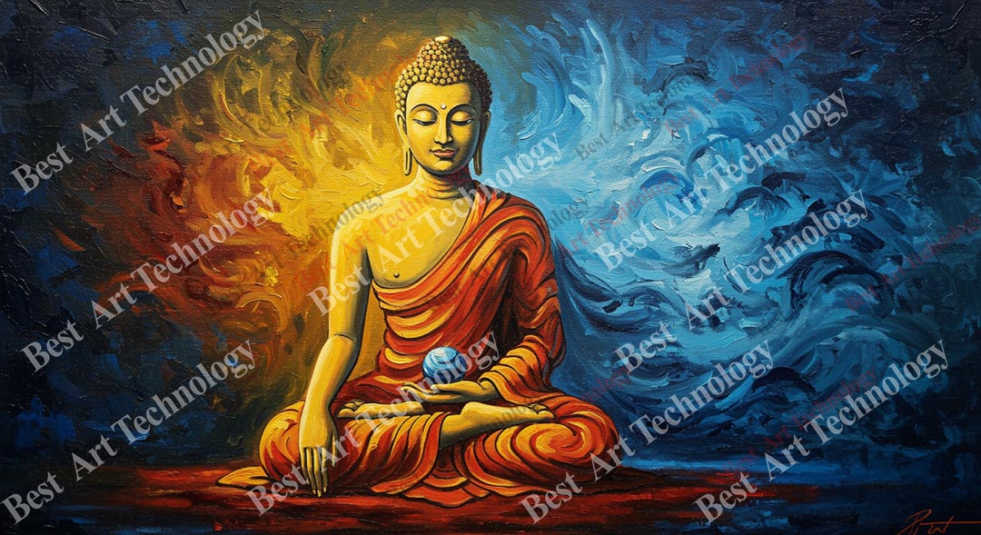 - High-Resolution Print: Captures the luminous gold Buddha, the glowing blue orb, and the smooth color transition in the textured background.