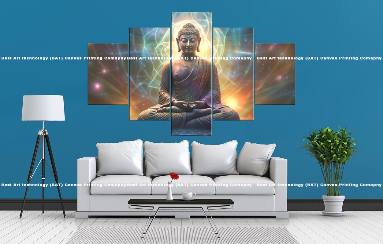 Introduce a sense of universal peace and wonder to your space with this multi-panel canvas art featuring the Buddha Cosmic Energy Canvas. A serene Buddha is depicted in deep meditation, surrounded by swirling and colorful cosmic energy with scattered stars, presented across five panels.