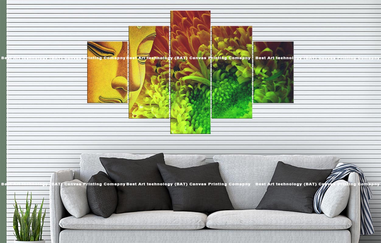 Introduce a unique blend of serenity and artistic flair to your space with this multi-panel canvas art featuring the Buddha Floral Abstract Canvas. A serene partial view of a Buddha face merges beautifully with vibrant and abstract floral patterns in rich, warm tones across five panels.