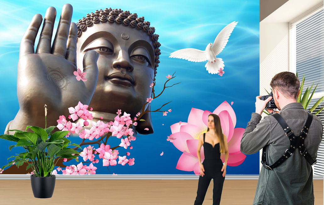Transform your wall with the Buddha Hand Dove Blossom Wallpaper. This tranquil design depicts a serene Buddha face and a large, open hand in a gesture of blessing, against a backdrop of a soft blue sky. A white dove, symbolizing peace, flies nearby, and branches of delicate pink cherry blossoms add a touch of natural beauty.