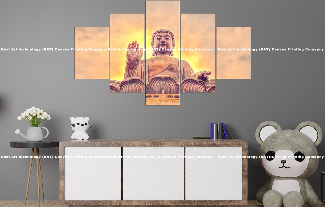 Bring the sacred story of Buddha’s birth to your space with this serene multi-panel canvas print. The artwork depicts the legendary birth of Gautama Buddha in a forest at Lumbini, with his mother holding a branch for support. This five-panel canvas captures the moment directly after his birth when he took seven steps and proclaimed his path to end suffering and achieve enlightenment. This Buddha in Lumbini Canvas will infuse your home with a sense of peace, history, and spiritual significance.