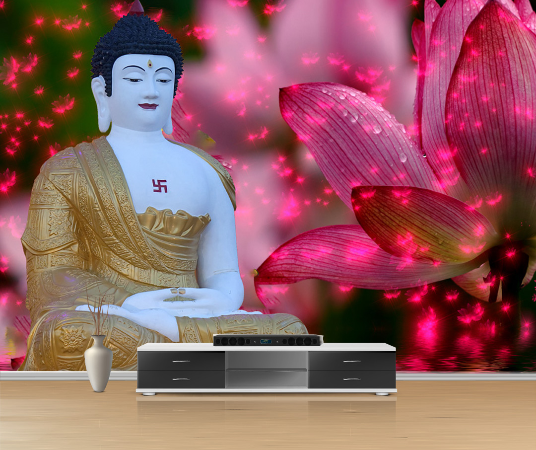 Transform your wall with the Buddha Lotus Bloom Wallpaper. This serene design depicts a Buddha seated in meditation, with a mix of white and golden robes, surrounded by large, vibrant pink lotus blossoms and sparkling light effects. The lotus flower symbolizes purity and enlightenment, creating a peaceful and spiritually uplifting atmosphere in any room.