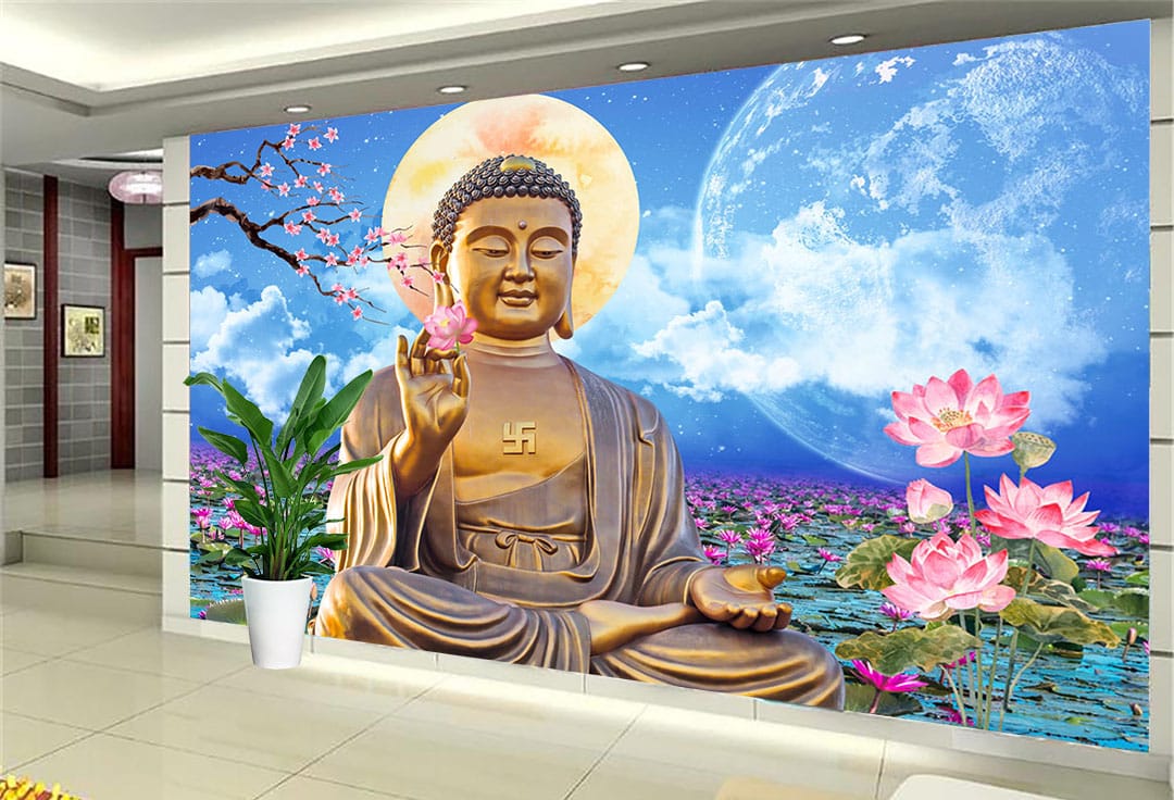 Transform your wall with the Buddha Lotus Moonlight Wallpaper. This serene design depicts a radiant golden Buddha seated in a meditative pose amidst a field of blooming pink lotus flowers under the soft glow of a large moon. Cherry blossoms frame the scene, creating a tranquil and spiritually uplifting atmosphere in any room.