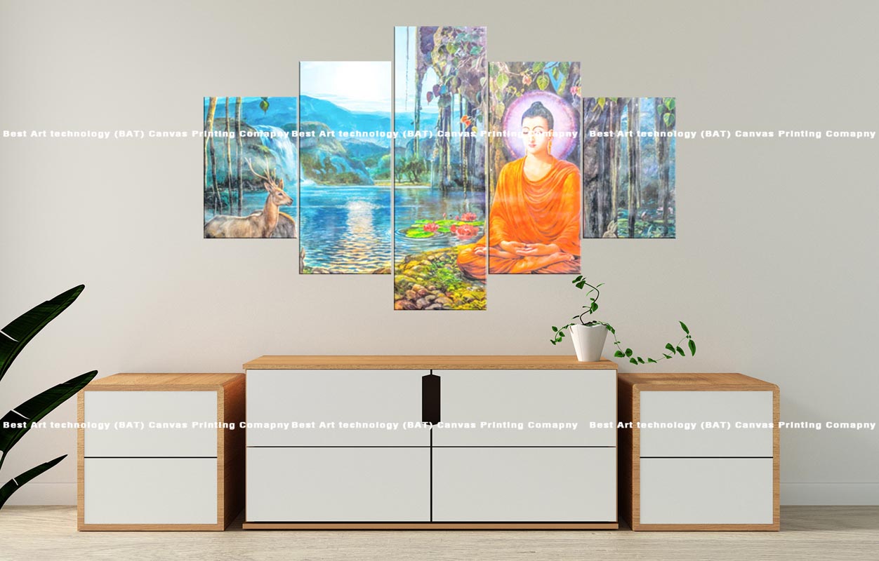 Bring the tranquility of nature and the peace of meditation to your space with this beautiful multi-panel canvas print. The artwork features Buddha in a serene meditative pose, surrounded by a calming natural landscape with water, lush greenery, and gentle wildlife, all spread across five panels. This Buddha Nature Meditation Canvas will infuse your home with a sense of calm and spiritual harmony.