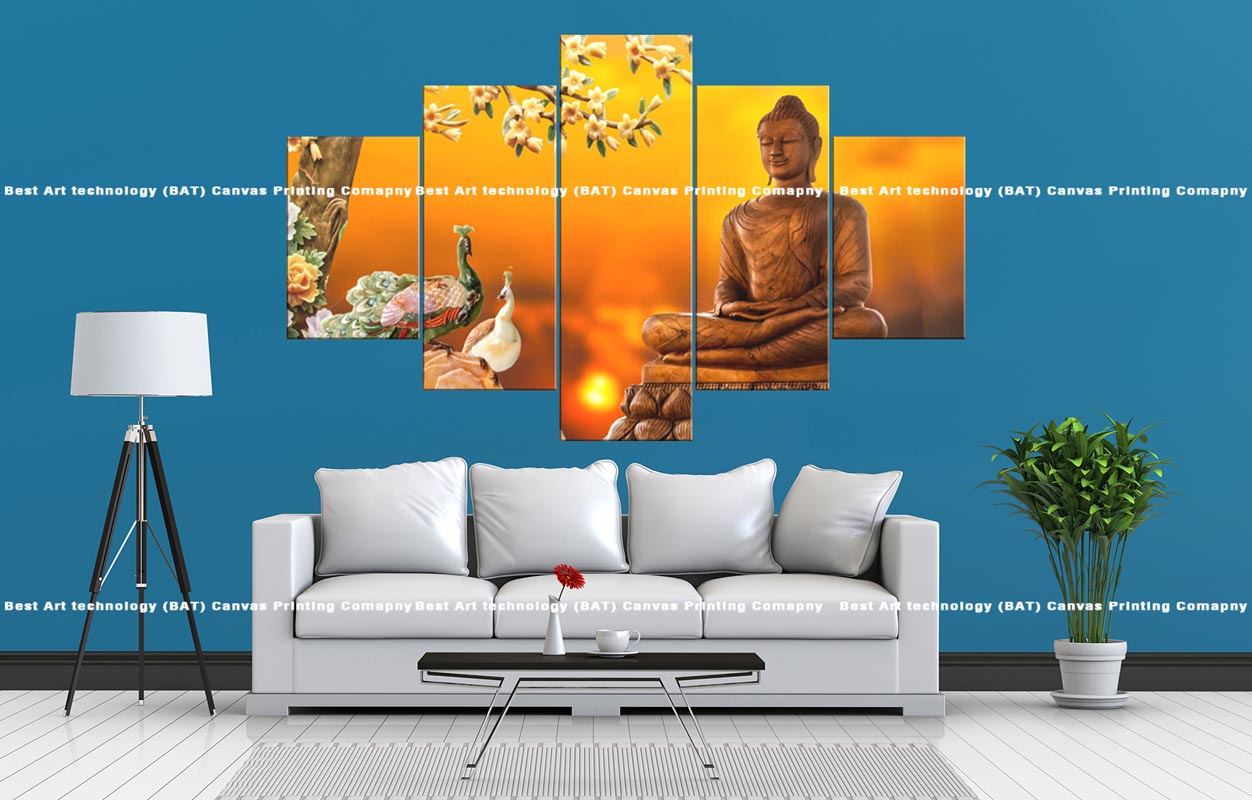 Introduce a sense of serene beauty and natural harmony to your space with this multi-panel canvas art featuring the Buddha Peacock Floral Canvas. A peaceful Buddha statue is depicted in meditation amidst elegant peacocks and vibrant blooming flowers, all set against a warm and radiant sunset sky across five panels.