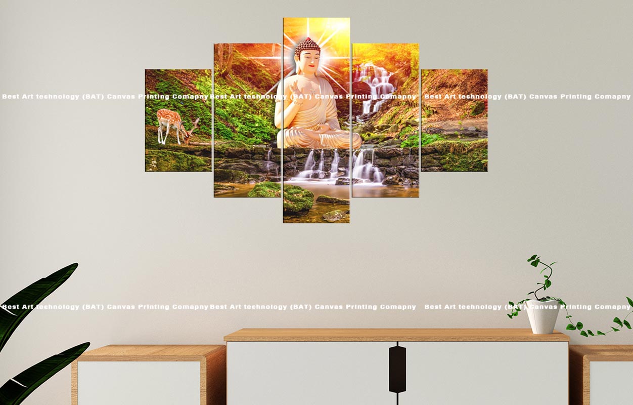 Bring a sense of profound peace and natural serenity to your space with this tranquil multi-panel canvas print. The artwork features a serene Buddha in a meditative pose beside a gentle waterfall, with graceful deer nearby in a sun-drenched natural landscape, all spread across five panels. This Buddha Waterfall Deer Canvas will infuse your home with a calming and harmonious atmosphere.