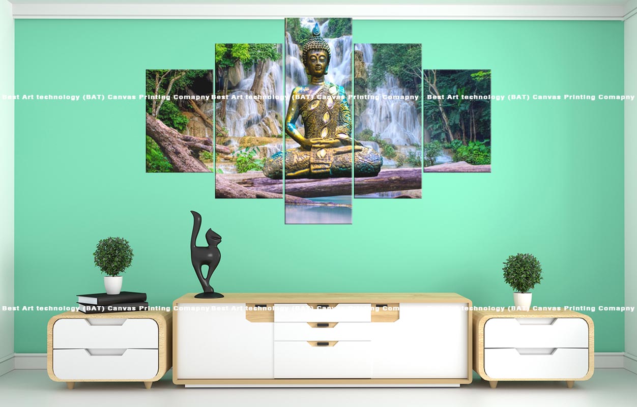 Bring the calming sounds and visual beauty of a waterfall together with the tranquility of meditation to your space with this serene multi-panel canvas print. The artwork features a peaceful Buddha in a meditative pose, set against the backdrop of a beautiful cascading waterfall surrounded by lush greenery, all spread across five panels. This Buddha Waterfall Meditation Canvas will infuse your home with a sense of calm, peace, and natural harmony.