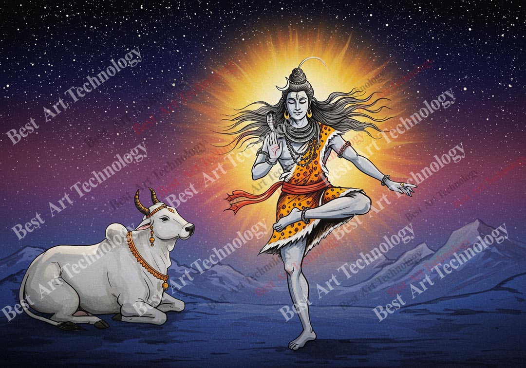 • High-Resolution Print: Captures the dynamic pose of Nataraja Shiva, the peaceful presence of Nandi, and the stunning cosmic starry backdrop with distant mountains.