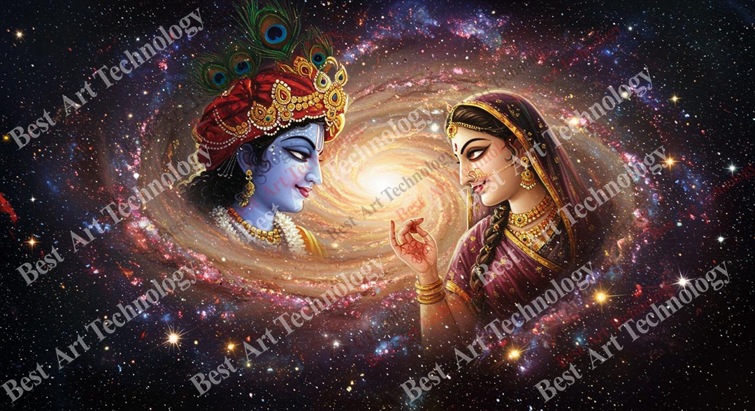 - High-Resolution Print: Captures the radiant portrait of Radha and Krishna and the detailed cosmic, starry background.