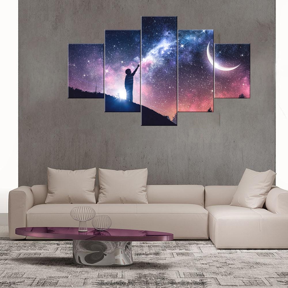 Transform your space with the inspirational Cosmic Reach Canvas Print. This multi-panel canvas art depicts a silhouette reaching out to a breathtaking vista of stars, galaxies, and a crescent moon. This image evokes a sense of wonder and limitless possibility.