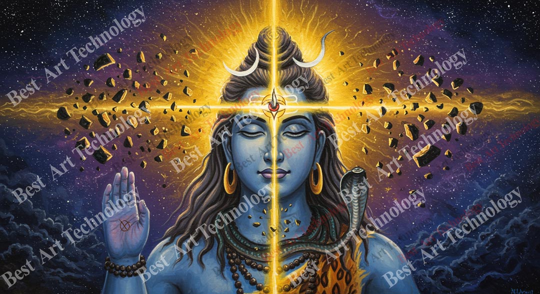 - High-Resolution Print: Captures the serene expression of Shiva, the radiant golden light, and the detailed cosmic background with subtle text and fragments.