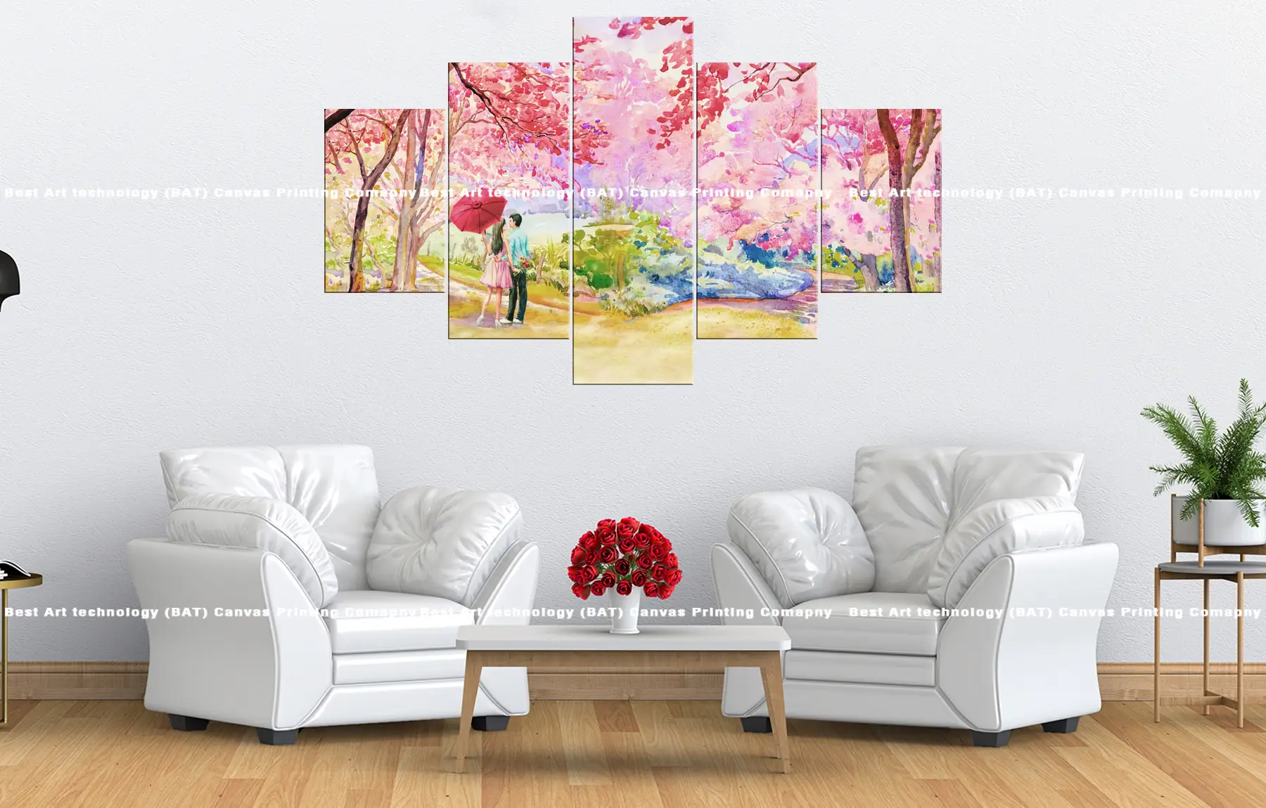 Introduce romance and the delicate beauty of spring to your space with this multi-panel canvas art featuring the Couple in Cherry Blossom Park Canvas Print. This enchanting artwork depicts a couple standing beneath a canopy of vibrant pink cherry blossoms, with a path leading into a serene, light-filled landscape, creating a whimsical and romantic atmosphere.