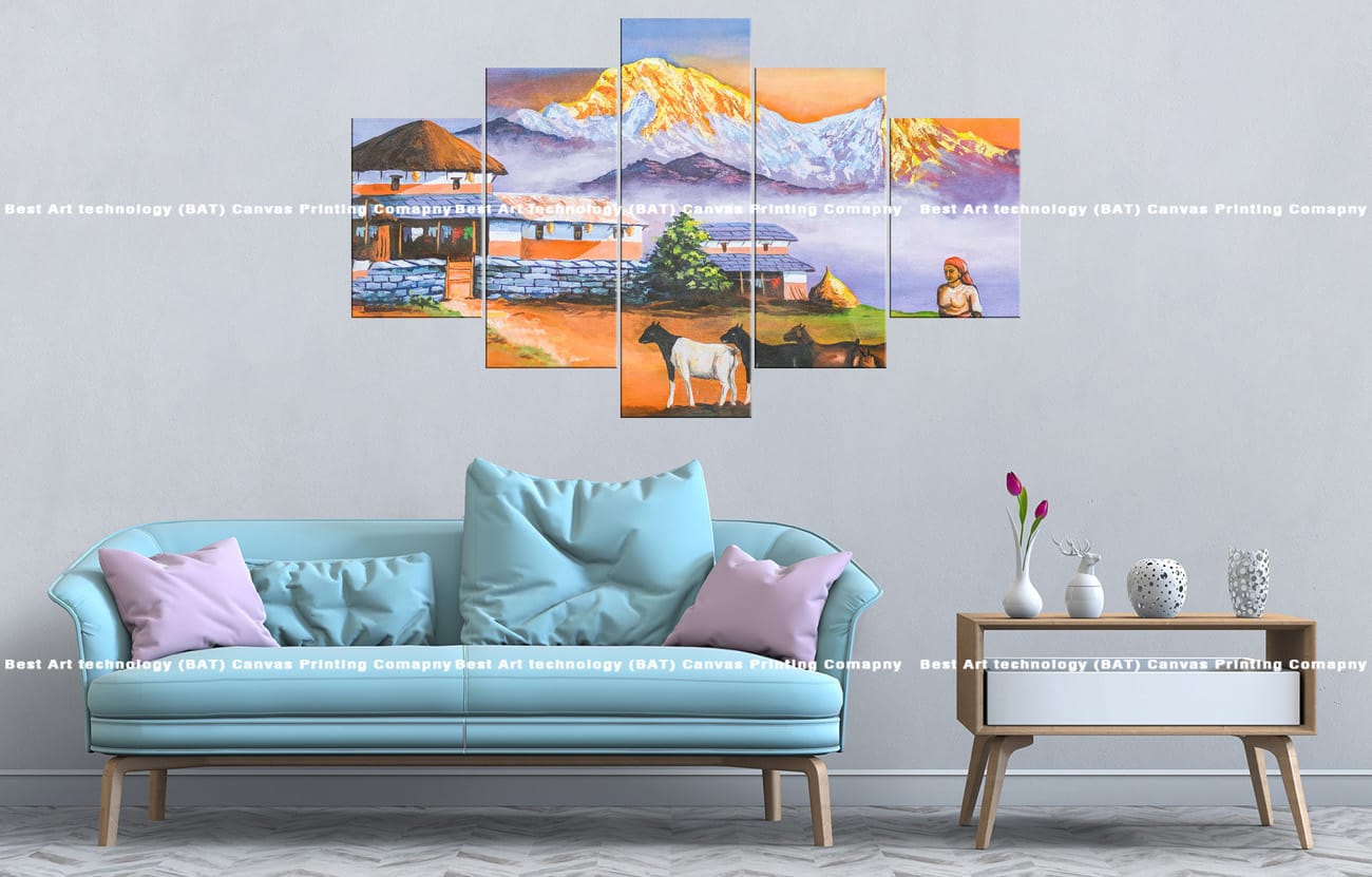 • Premium Quality Canvas Print: High-resolution multi-panel painting of a dawn scene over a Nepali farm and mountains.