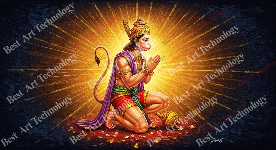 - High-Resolution Print: Captures the humble kneeling posture of Lord Hanuman, his folded hands, the radiant golden aura, and the scattered flower petals.
