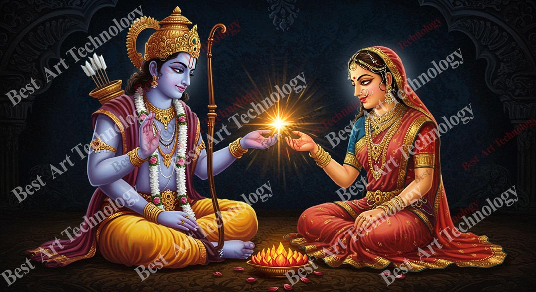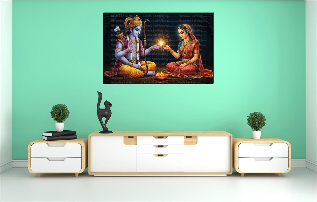 • High-Resolution Print: Captures the serene figures of Rama and Sita and the radiant divine light they share in a forest setting.