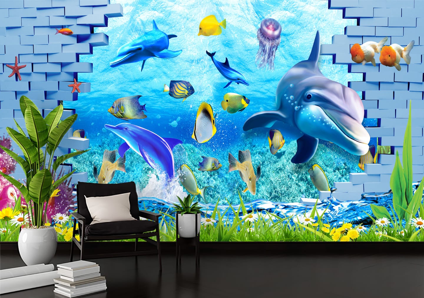 Transform your wall with the delightful Dolphins Underwater World 3D Mural. This design creates a captivating 3D effect, as if a vibrant underwater world is bursting through a stylized blue brick wall. Playful dolphins swim alongside colorful tropical fish and a jellyfish in clear blue waters, extending into a whimsical foreground with grass and flowers. This mural brings a sense of joy and the beauty of the ocean into any space.