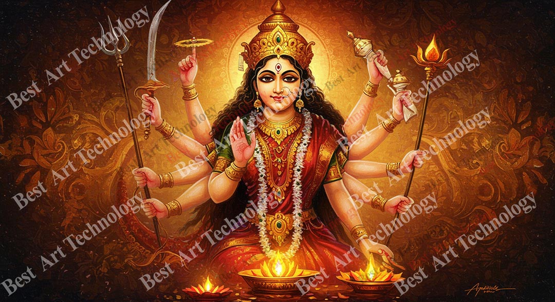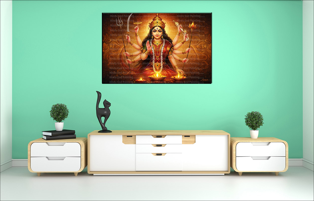 - High-Resolution Print: Captures the powerful image of Goddess Durga, her multiple arms and weapons, and the majestic lion against the fiery backdrop.